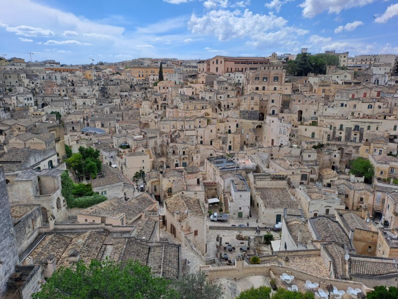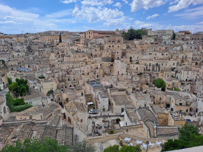 Mint már megszoktuk, Bariból sem találtuk a városból kivezető utat Matera irányába. Gondoltam, ki lesz írva a település, hisz a UNESCO világörökség részét képezi a barlanglakások, de vagy apró betűvel volt a táblákon vagy tábla sem volt. Elautókáztunk kényelmesen még Bariban, megnéztük minden zegzugát, mígnem végre már Matera az útjelző feliratokon is feltűnt. Száz évvel ezelőtt még senki sem gondolta volna, hogy a kisváros egyszer ilyen hírnévre tesz szert. Sassi di Matera a város azon negyede, ahol – bár hihetetlennek tűnik – az 1950-es években még sok lakásban sem víz, sem áram nem volt, tulajdonképpen nyomornegyednek számított akkoriban ahol ezrek éltek. A 20.század második felében felszámolták a nyomornegyedet és átköltöztették a város más részeibe az itt élőket, hogy megfelelő higiéniai körülmények között éljenek. Pusztulásnak is indultak a barlanglakások, ám az 1980-as években meglátták benne a lehetőséget, és felújították őket, majd pedig a turisták egyik kedvelt helyévé tették, illetve számos filmet is forgattak itt ebben a különös környezetben, elsősorban vallási témájú ókori filmek, 2016-os Ben-Hurt. Ebben a sziklaoldalban voltak Olaszország első lakott barlangjai több ezer évvel ezelőtt.