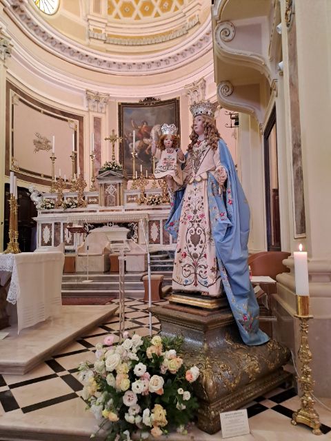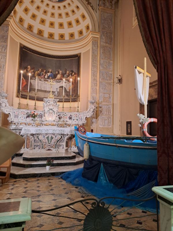 Via Vittorio Veneton parkoltunk le és az új városkapun keresztül sétáltunk be az óvárosba. Church of Saint George Martyr a legnagyobb temploma Locorotondonak, külön érdekessége volt mikor ott jártunk, hogy az oldalsó kápolnában egy kék színű bárkát helyeztek el. Ez valószínűleg nem állandó kelléke a templomnak, bizonyára csak valamiféle szokás, áldás kérése a halászokra (bár nem tengerparti település). Több templom is megbújik a sikátoros utcákon, de szinte annyira egybe épült a házakkal és bele simul a környezetébe, hogy észre sem venni.