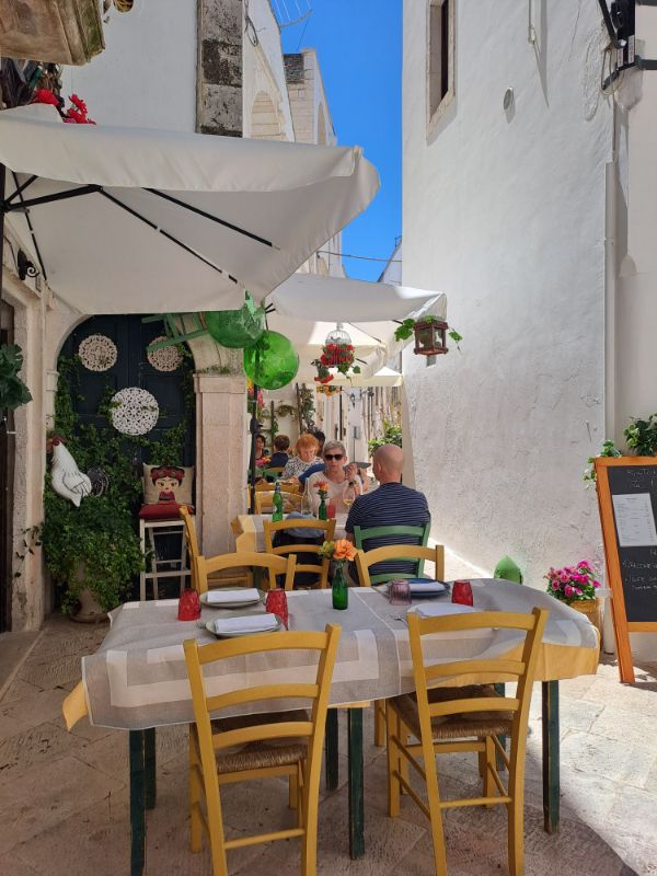 Alberobellóból a kedvencemmé vált kisvárosba, Locorotondóba autóztunk tovább. Mitől oly különleges? Tulajdonképpen semmi extra látnivaló nincs, viszont a hangulata miatt oly bájos. (Karácsony előtt egyébként még pompásabb, a helyiek gyönyörűen feldíszítik az egész városkát.) Szűk utcák, sikátorok, színes kerámiák, a vendéglők, bárok előtt színes vagy épp hófehér székek és asztalok, a levegőben pedig a remek pugliai konyha illata szállt. Igazából Locorotondoban lenni egy leírhatatlan életérzés, amit mindenkinek ki kell próbálnia.