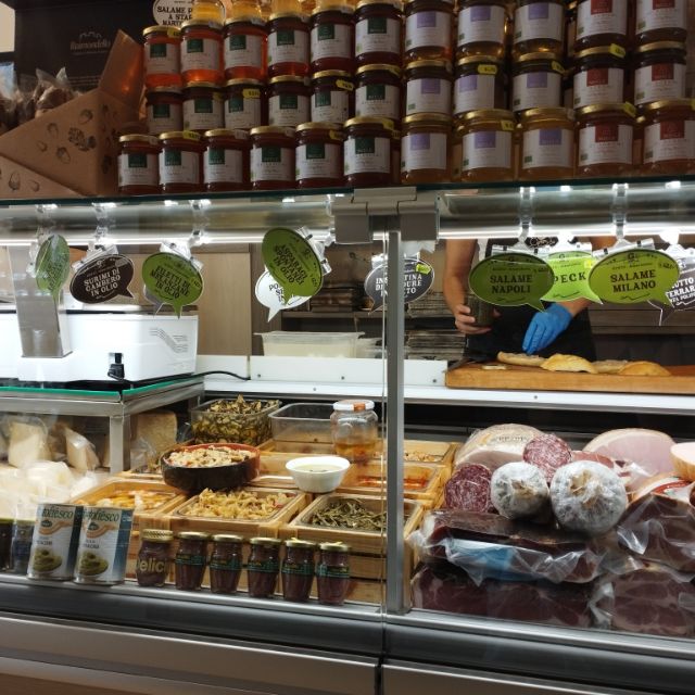 A lépcsőn leérve egy térre csöppenünk, ahol éttermek, bárok sokasága próbálja meg az éhes turista tömeget jól lakatni. Van itt egy helyi specialitás, egy szendvics, amit hiába kerestünk bármely éttermesnél, sehol nem volt kiírva az ajánlatok közé. Míg végül egy szuvenírárust megkérdeztünk, aki annyira segítőkész volt, hogy egyenesen elkísért a helyre, ahol ezt a tartalmas szendvicset készítik. A Gusto Salumi & Formaggi nevű, tulajdonképpen egy kisboltban sikerült rálelni erre az egyébként egyáltalán nem extra szendvicsre, de legalább jó borsos árat fizettünk érte. Ez a pasqualino szendvics, amelyet először 1966-ban készítettek, az ízek kombinációját Pasquale Dell’Erba, egy élelmiszerbolt tulajdonosa találta ki. Az összetevőkben semmi bonyolult nincs, mindössze talán annyi, hogy a halat szalámival és sajttal párosította, valamint még kapribogyó a hagyományos összetevő, de már a modernebb változata egyéb kiegészítőket is tartalmazhat.