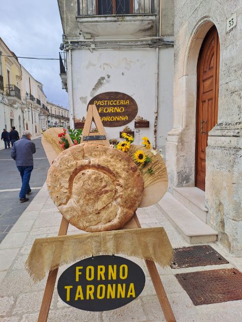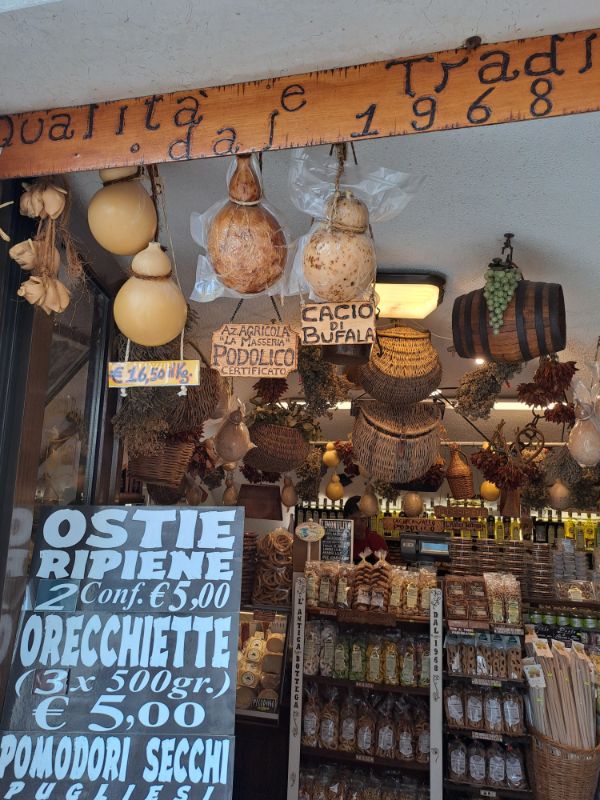 Felértünk a bájos kis faluba, ott már csak egy dologtól rettegtem, hogy el ne tévedjünk, mert itt aztán az életben meg nem fordulunk. Úgyhogy én folyton ezt mondogattam, „ne menj tovább, ne menj feljebb, jó lesz már itt.” (Van egy nagyobb parkoló a szentélytől és a vártól nem messze, de mi a Via Belvedere-n tettük le az autót) A Via Belvederén sétáltunk végig a bazilikáig, az utca nevében is benne van, hogy szép látvány és valóban innen jól kivehetőek a tengerparti települések. Az utcát pékségek, kis delicatesek szegélyezik, ahol cacciacavallo sajtot, szalámikat, prosciuttot és péktermékeket lehet beszerezni. Hatalmasabbnál hatalmasabb kenyerek és itt is beszerezhető a Pugliában népszerű tarallini, a kis kerek kekszek.