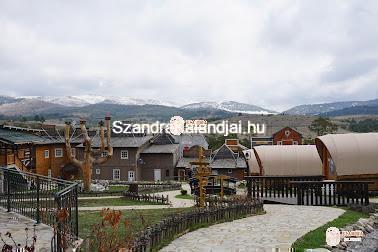 A kolostor után a sirogojnói skanzen következett, melyhez Uzice után kellett a főútról letérni. Az út egy fennsíkon haladt, ahonnan gyönyörű kilátás nyílt a környező dombokra, hegyekre. A skanzenba belépőjegy van. Mi úgy képzeltük el a leírások alapján, mint egy eredeti állapotában megmaradt „élő” falu, ahol az ott lakók a hagyományaikat őrzik. Ehhez képest ez egy szabadtéri múzeum, ahol az épületek többsége le volt lakatolva. Csupán néhány régi épületbe lehetett belesni az ajtóból, ahol a sötétségtől kb. semmit nem lehetett látni. Viszont arra jó volt, hogy nyakig sárosak legyünk. Belépőjegy van.